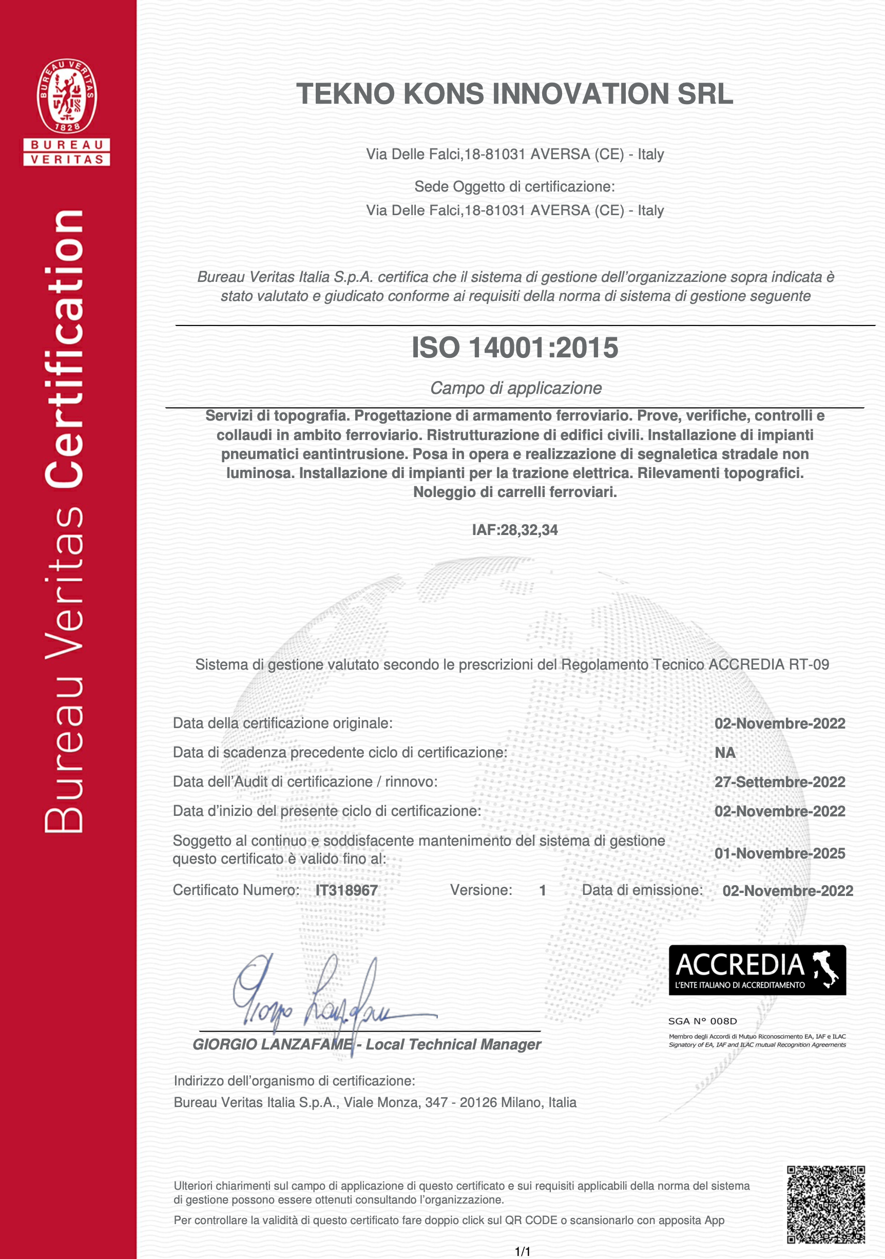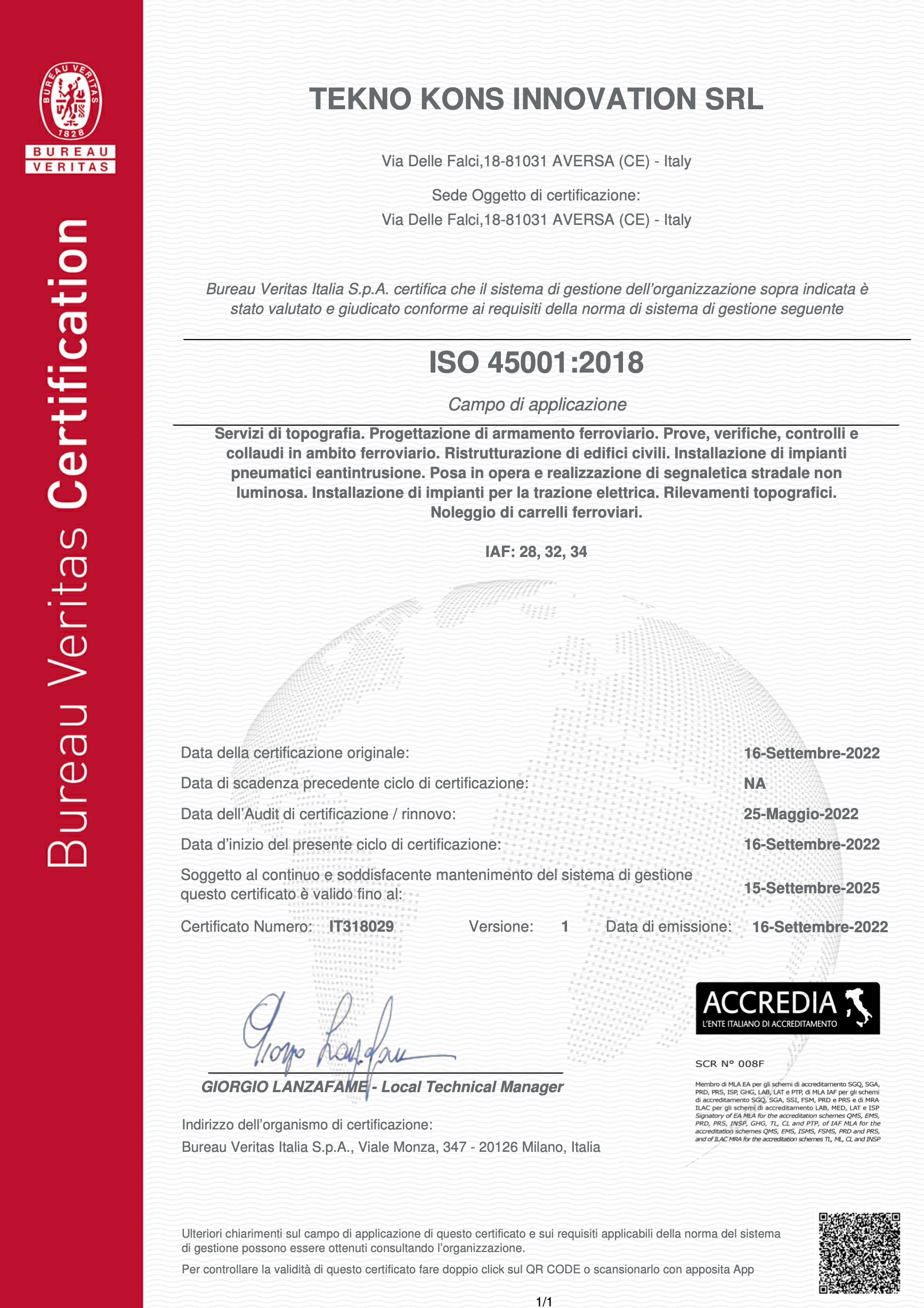 Tekno Kons Innovations attribuisce grande importanza alla salvaguardia degli aspetti legati alla sicurezza sui luoghi di lavoro ed all’ambiente, pertanto ha avviato le pratiche per la qualificazione al Sistema di Gestione dell’Ambiente ISO 14001:2015 e al Sistema di Gestione della Sicurezza sul Lavoro ISO 45001:2018 (ex OHSAS 18001:2007), che rappresentano l’obiettivo futuro per raggiungere la qualifica di Sistema Integrato.
